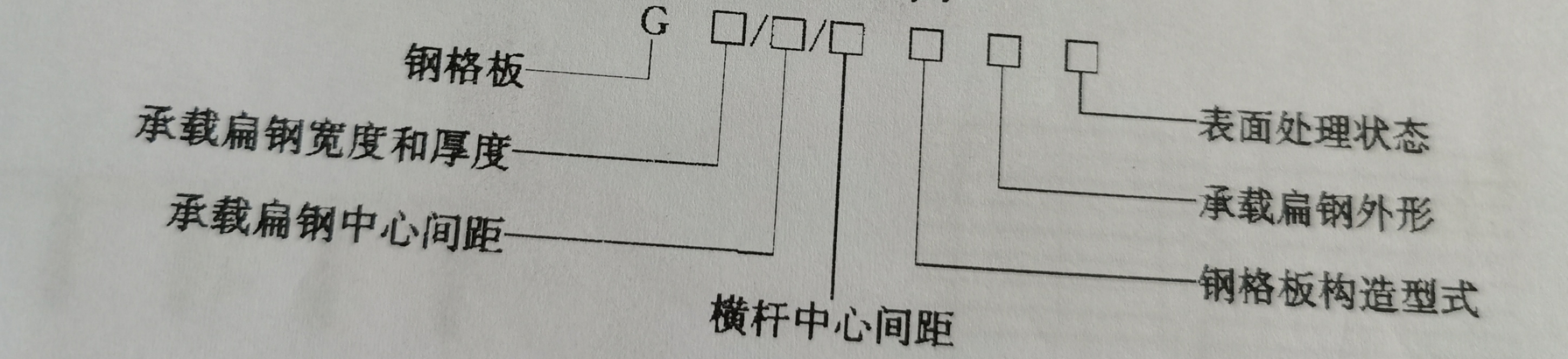 1钢格板的型号,根据承载扁钢规格,承载扁钢与横杆组合间距、钢格板结构型式、承载扁钢外形,以及表面处理状态等不同,形成多种规格,型号表示方法如下: